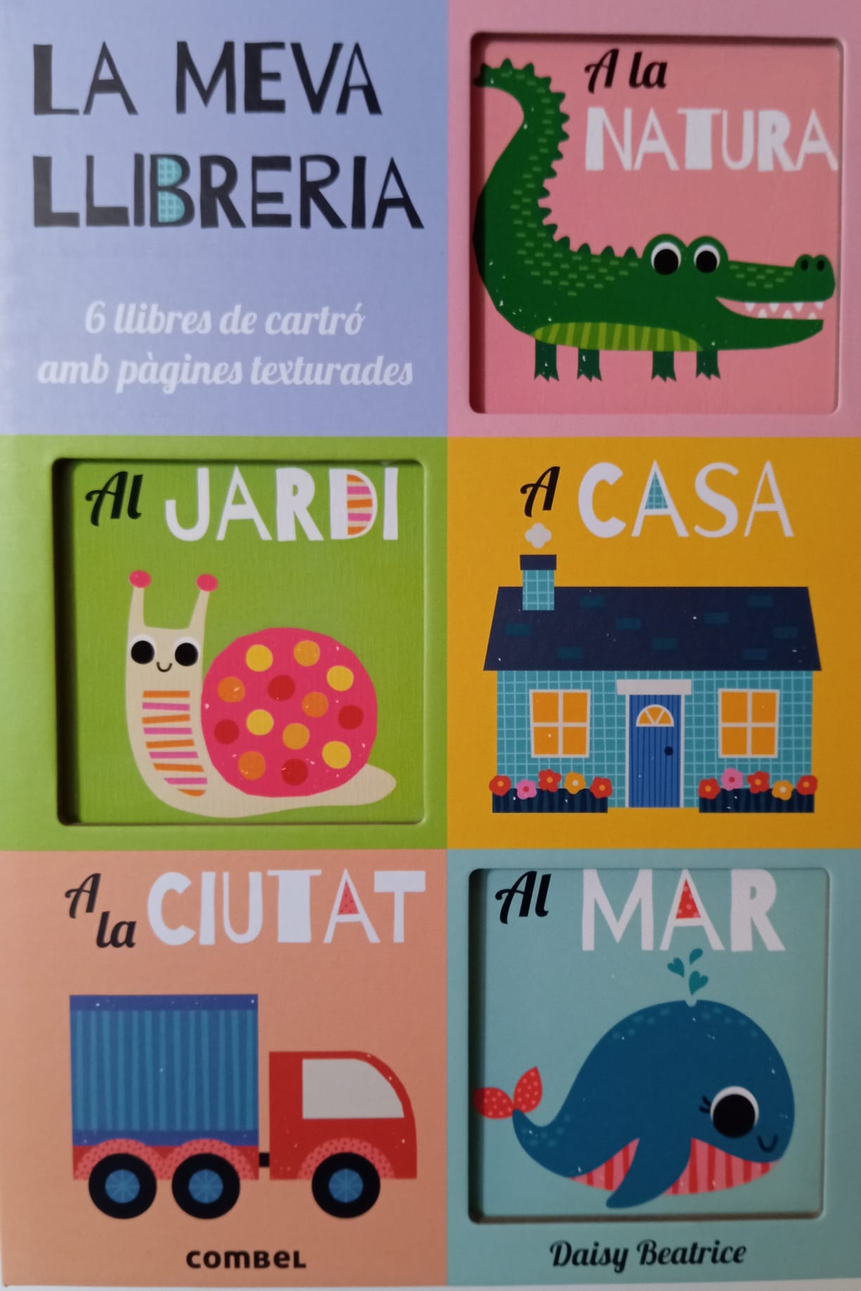 Una capsa amb un pràctic tancament d’imant i que inclou sis llibres amb pàgines texturades, amb imatges i paraules que introduiran els petits lectors al món que els envolta: el mar, la natura, la granja i les coses, i els animals de la casa, de la ciutat i del jardí.